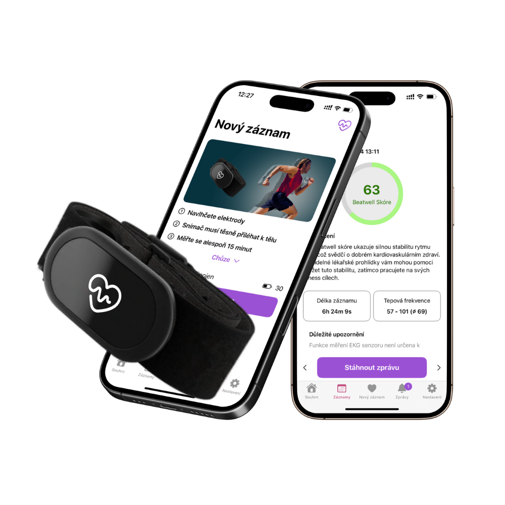 **Beatwell** <img src="https://3605945451-files.gitbook.io/~/files/v0/b/gitbook-x-prod.appspot.com/o/spaces%2FYmq3qTXFthW3XQzMTPjm%2Fuploads%2Fgit-blob-fca7152dc9bba7acdba86c9babd0d02c23f048bd%2Fapp_icon_beatwell_small.png?alt=media" alt="" data-size="line"> je systém pro monitorování zdraví, který Vám umožňuje sledovat **rytmus Vašeho srdce** v reálném čase. Skládá se z **aplikace pro smartphone** a **přesného hrudního pásu**, které spolupracují na poskytování přesných **EKG záznamů přímo do Vašeho zařízení**. Systém nepřetržitě sleduje elektrickou aktivitu Vašeho srdce a vyhodnocuje záznamy pomocí pokročilé **umělé inteligence**, což Vám umožňuje sledovat svou srdeční aktivitu kdykoliv a kdekoliv.